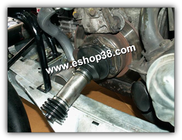 - Contrairement à la photo il est conseillé de commencer à introduire le petit soufflet sur le demi-cardan coté roue (à l'aide d'un cone, goulot d'une bouteille plastique) pour réaliser l'assemblage du cardan.