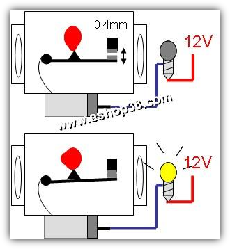 Une ampoule 12V est nécessaire pour la suite des réglages. On branchera une de ces bornes au 12V de la batterie (voir schéma ci-contre) et l'autre en sortie du condensateur (pour ces tests le contact est coupé !).
