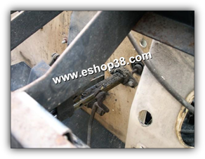 - Concernant le frein à main il suffit de retirer le clips situé en bout de biellette de renvoi de commande et de dévisser les 2 vis de la platine de guidage (voir photo ci-après) pour permettre le retrait total de la poignée de son support .