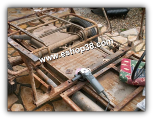 - L'ensemble chassis, tubulures, support de sièges, essieux, pot de suspension, amortisseur, réservoir sont maintenant accessibles. On peut noter une corrosion importante sur de nombreux éléments.