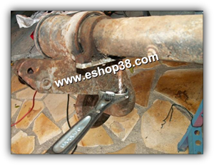 - Pour extraire le PDS il faut désserer les 2 écrous (8) du support de PDS arrière. Personnellement, j'ai utilisé une clé à molette de grande taille. Cependant même avec le bon outillage certain assemblage résiste, ce fut mon cas. J'ai donc réalisé un trou de 6mm traversant la patte de fixation du PDS et le support de PDS (7). Attention lors du perçage de ne pas endommager le tirant, le but n'est pas de traverser dans son intégralité le support de PDS (7) mais d'éviter sa rotation pendant le dévissage des écrous. Ensuite il suffit d'introduire un axe dans l'orifice pour neutraliser la rotation du support de PDS. Pour le support de PDS avant la technique reste la même sauf qu'il ne faut percer que le support de PDS car la patte de fixation du PDS est fendue (photo ci dessous, flèche bleue).